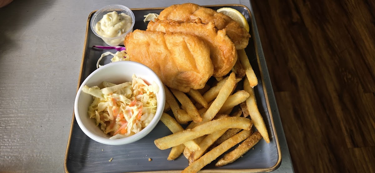 The menu is built around comfort food with island character. One of the most talked-about plates is the Loco Moco, a hearty classic that lands on the table hot and satisfying. It’s the kind of dish that fits perfectly with a relaxed lunch, especially when paired with a cold beer from the bar. The Ono fish and chips also stand out, delivering flaky fish with a crisp bite that feels right at home in a coastal setting. If you’re leaning toward familiar favorites, the hamburger is straightforward and filling, while the chicken strips keep things simple without sacrificing flavor.