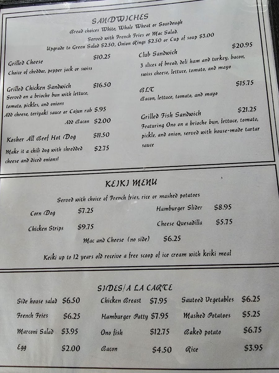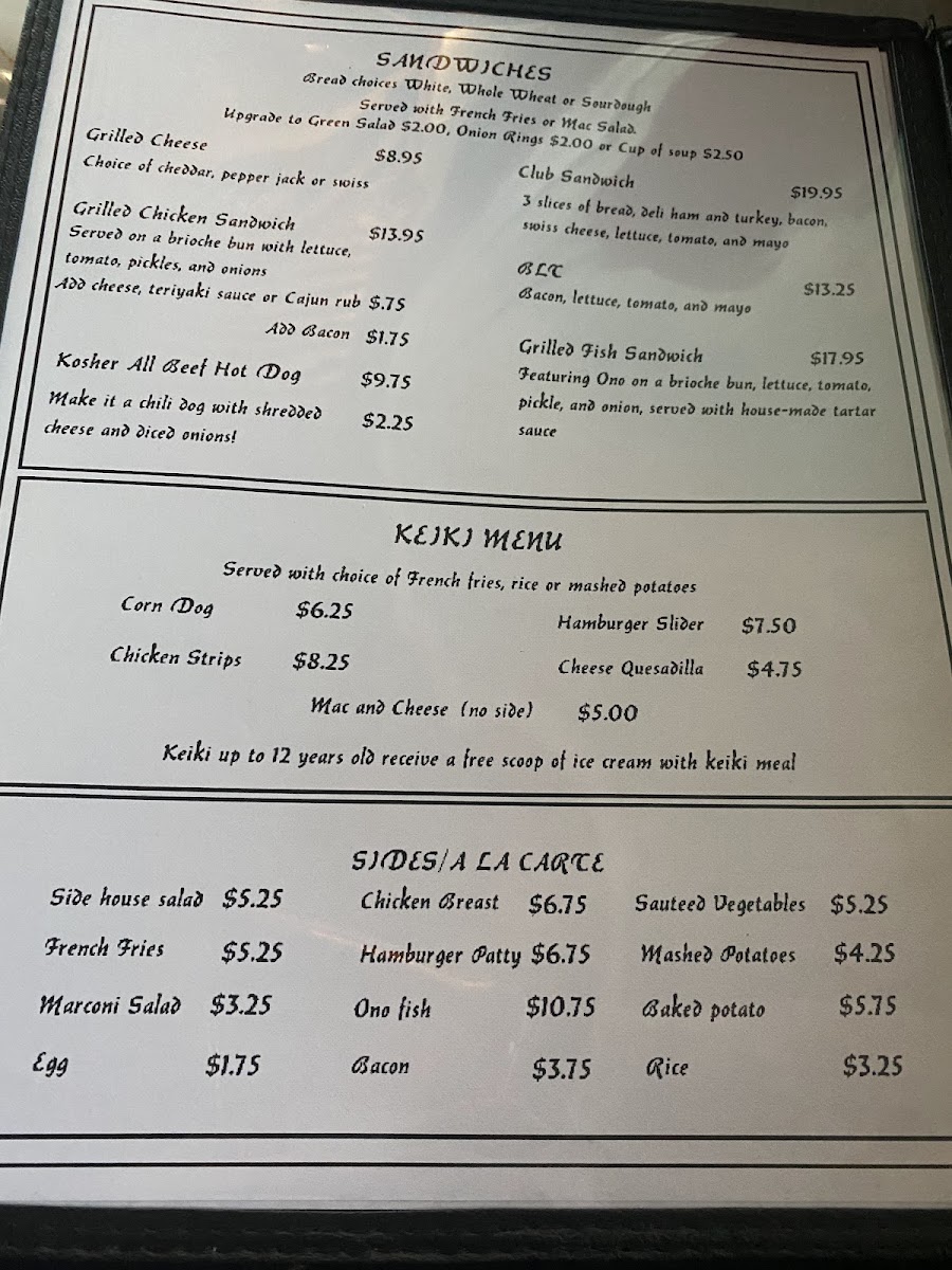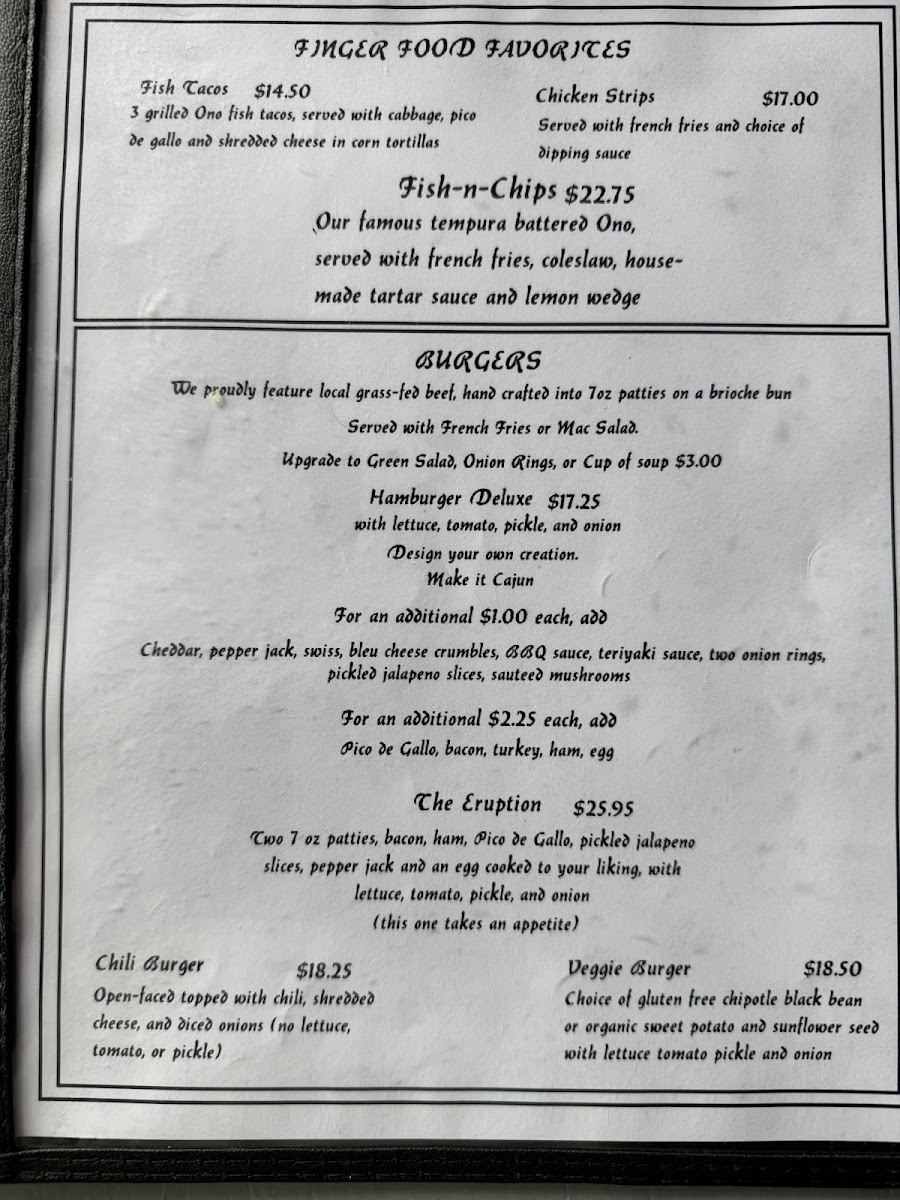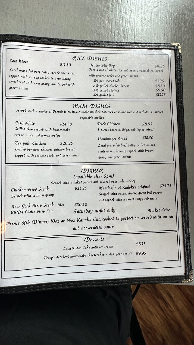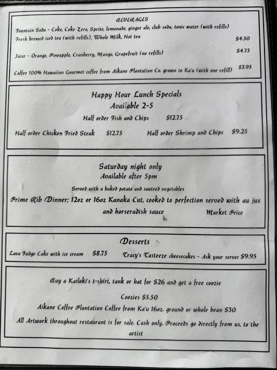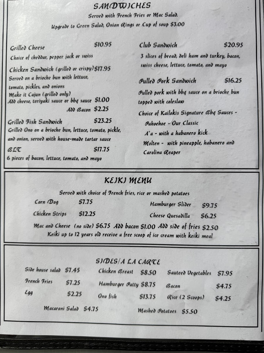 From a reviewer’s perspective, the menu at Kailoki’S Restaurant Southernmost Bar in the U.S offers a simple yet well-rounded dining experience that reflects both local charm and casual comfort. Starting with the Cover, the restaurant sets the tone for an easygoing meal, making it clear that this is a place focused more on atmosphere and satisfaction than unnecessary complexity. The Pupus and more - Best burgers on isle section highlights one of the strongest selling points of the restaurant, positioning their burgers as a must-try and creating high expectations right from the start. Moving on to Burgers and more - Grass fed burgers and more, this category reinforces the restaurant’s commitment to quality ingredients, especially with grass-fed beef that appeals to health-conscious diners while still delivering rich flavors. For lighter or more flexible options, Sandwiches and more - Keiki provides a friendly choice, particularly suitable for kids or those who prefer something less heavy. Finally, Rice dishes - So many options adds diversity to the menu, ensuring that guests who enjoy hearty, filling meals also have plenty to explore. Overall, Kailoki’S menu may not be overly long, but it is thoughtfully structured, easy to understand, and focused on satisfying a wide range of tastes, making it a reliable choice for both locals and travelers looking for a relaxed dining spot in Ocean View, Hawaii.
